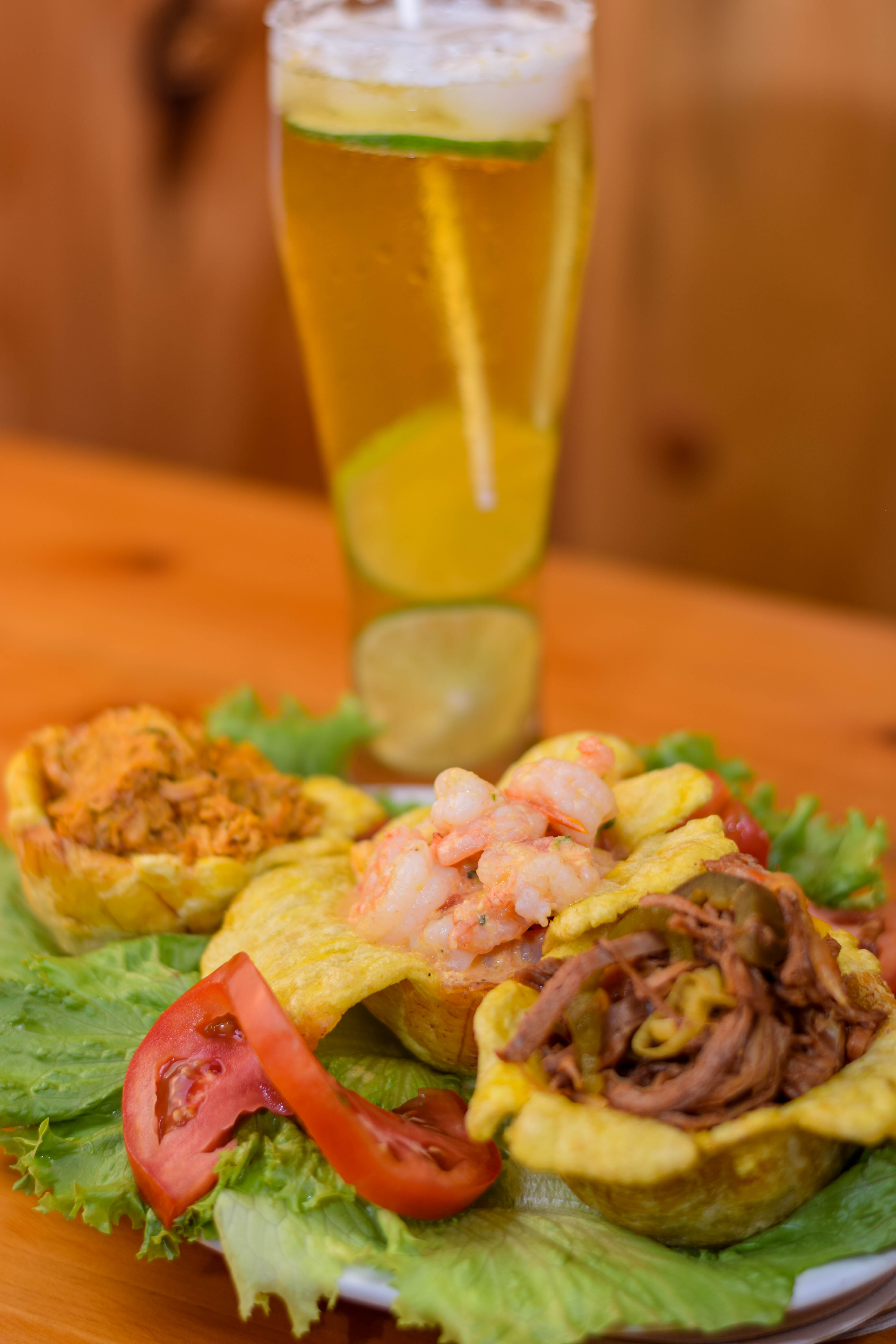 Plátanos verdes fritos acompañados con frijoles molidos, carne, repollo y salsa rosada. Un clásico costarricense.