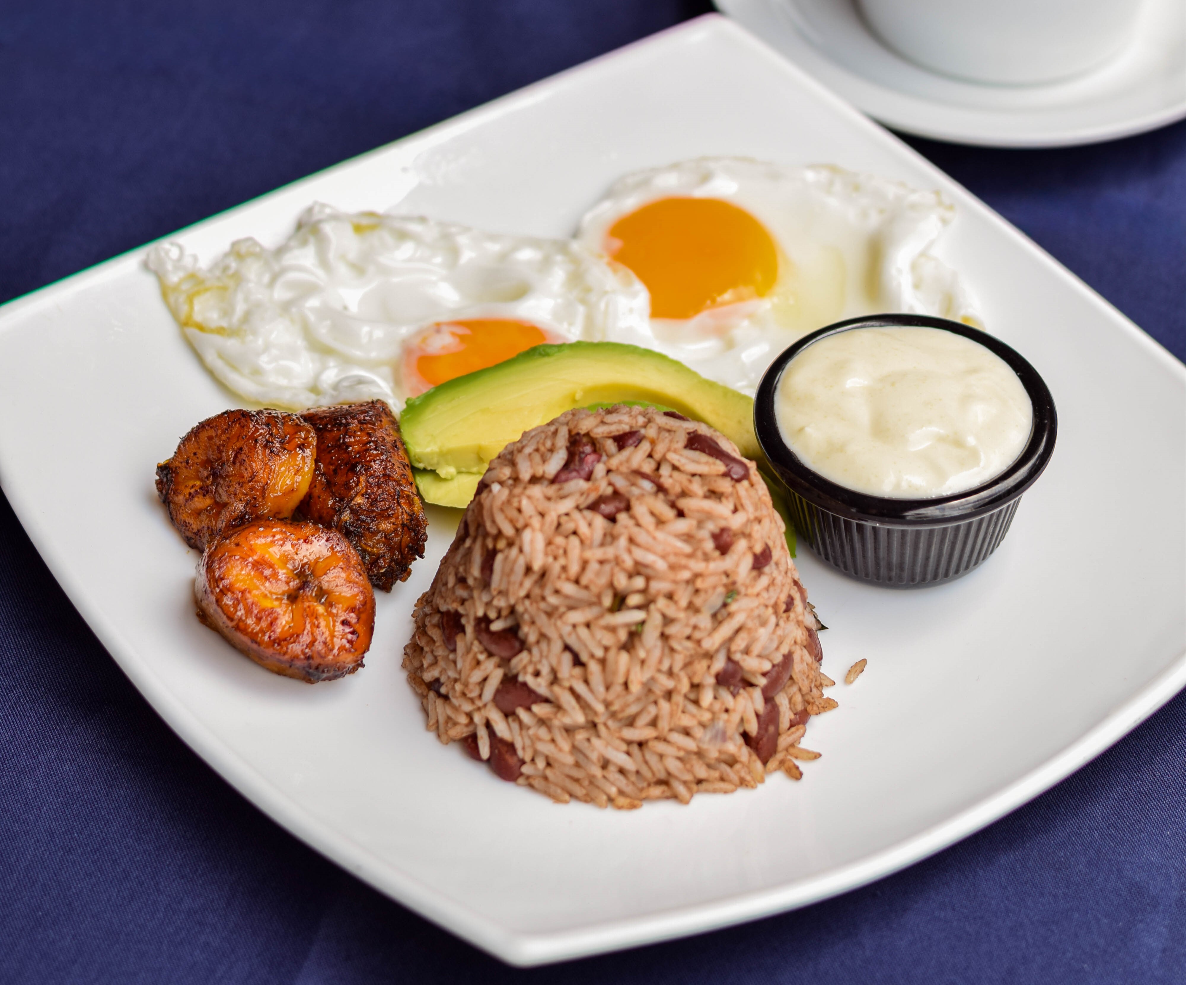 Gallo pinto con, huevo, natilla, maduro y aguacate.