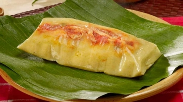 Masa de maíz rellena de carne y vegetales, envuelta en hoja de plátano.